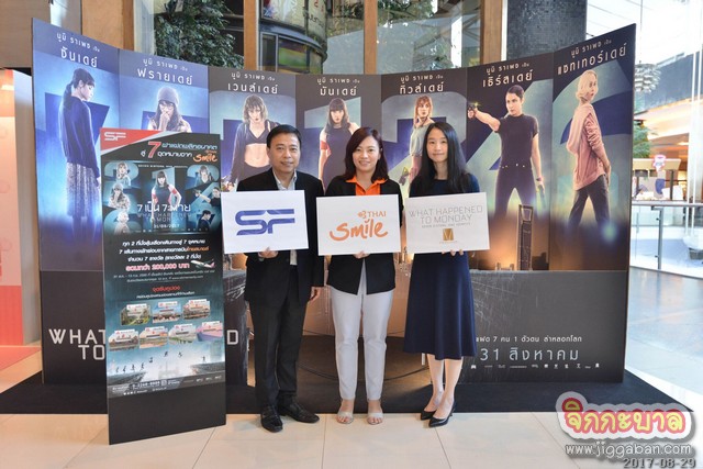 โรงภาพยนตร์ในเครือเอส เอฟ โดย คุณสุพัฒน์ งามวงศ์ไพบูลย์ ผู้อำนวยการฝ่ายการตลาด บริษัท เอส เอฟ คอร์ปอเรชั่น จำกัด (มหาชน) (ที่หนึ่งจากซ้าย) ร่วมกับ ตัวแทนจากสายการบินไทยสมายล์ (ที่สองจากซ้าย) และ คุณอวิกา เตชะรัตนประเสริฐ รองประธานกรรมการ ฝ่ายการตลาด บริษัท มงคลเมเจอร์ จำกัด (ที่สามจากซ้าย) แท็กทีมปล่อยโปรโมชั่นเด็ดเปิดตัวภาพยนตร์แอคชั่น-ไซไฟคอนเซ็ปท์เหนือชั้น พล็อตล้ำ 7 ฝาแฝด 1 ตัวตน “What Happened to Monday 7 เป็น 7 ตาย” เพียงแค่ซื้อบัตรชมภาพยนตร์ มีสิทธิ์ลุ้นรับตั๋วเครื่องบินฟรีได้ไม่ยาก