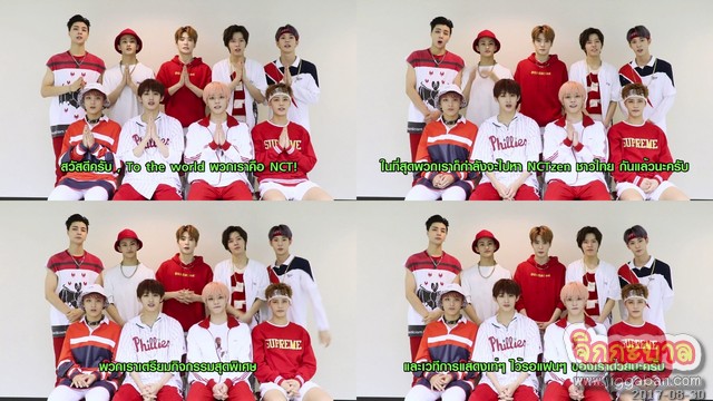 “สวัสดีครับ, To The World พวกเราคือ NCT! สวัสดีครับ พวกเรา NCT 127 ครับ ทุกคนได้ยินข่าวดีกันหรือยังครับ? ในที่สุดพวกเราก็กำลังจะไปหาแฟนคลับชาวไทยกันแล้วนะครับ ว๊าว! พวกเราตื่นเต้นกันมาก ๆ เลยครับ พวกเราเตรียมกิจกรรมสุดพิเศษ และเวทีการแสดงเท่ ๆ ไว้รอแฟน ๆ ของเราด้วยนะครับ ทุกคนสงสัยแล้วใช่ไหมครับว่างานจะมีเมื่อไหร่? ผมรู้ครับ! พวกเราจะไปเจอกับทุกคน ในวันเสาร์ที่ 9 กันยายน 2560 นี้ ณ ธันเดอร์โดม เมืองทองธานีนะครับ อย่าลืมติดตาม และเตรียมตัวมาสนุกกับพวกเราด้วยนะครับ จนถึงตอนนี้อยู่กับ NCT 127 ครับ To The World พวกเราคือ NCT! เจอกันนะครับ~ ขอบคุณครับ~”