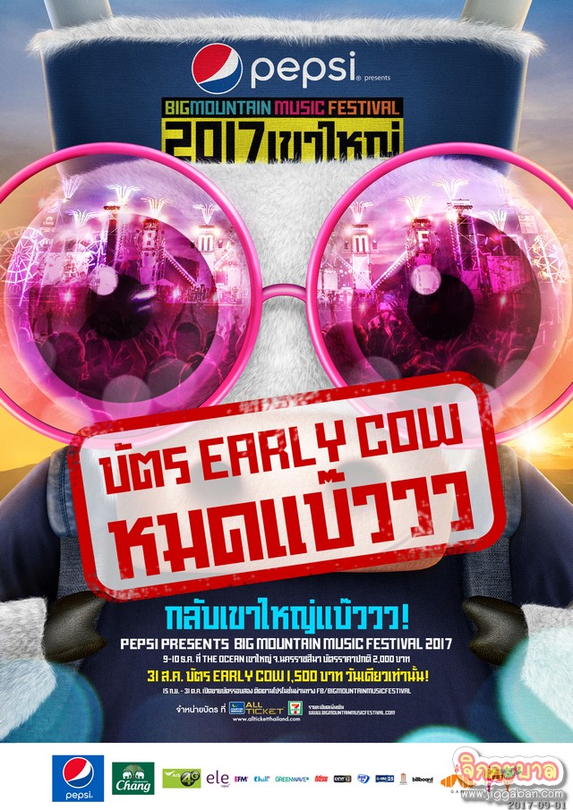 ข่าวดีสุดๆ ใครที่พลาดบัตร Early Cow ตอนนี้ เป๊ปซี่ พรีเซนต์ บิ๊ก เมาน์เท่น มิวสิค เฟสติวัล 2017 เปิดขายบัตรราคาสุดพิเศษเพิ่มเติมเพียง 1,900 บาท (จากราคาปกติ 2,000 บาท) แต่เมื่อซื้อเป๊ปซี่ หรือ เป๊ปซี่ แมกซ์เทสต์ ขนาด 550 มล. จำนวน 3 ขวด (ต่อใบเสร็จ) รับส่วนลดเพิ่มทันที 300 บาท ตั้งแต่วันที่ 15 ก.ย. ถึง 31 ต.ค. นี้เท่านั้น จำหน่ายบัตรที่ เคาน์เตอร์เซอร์วิส ออลล์ ทิคเก็ต ในร้าน เซเว่นอีเลฟเว่น ทุกสาขา ทั่วประเทศ และ www.allticketthailand.com สามารถตามติดรายละเอียดเพิ่มเติมที่ FB: BigMountainMusicFestival / www.bigmountainmusicfestival.com แบ๊วววมาสนุกกัน…ที่เขาใหญ่