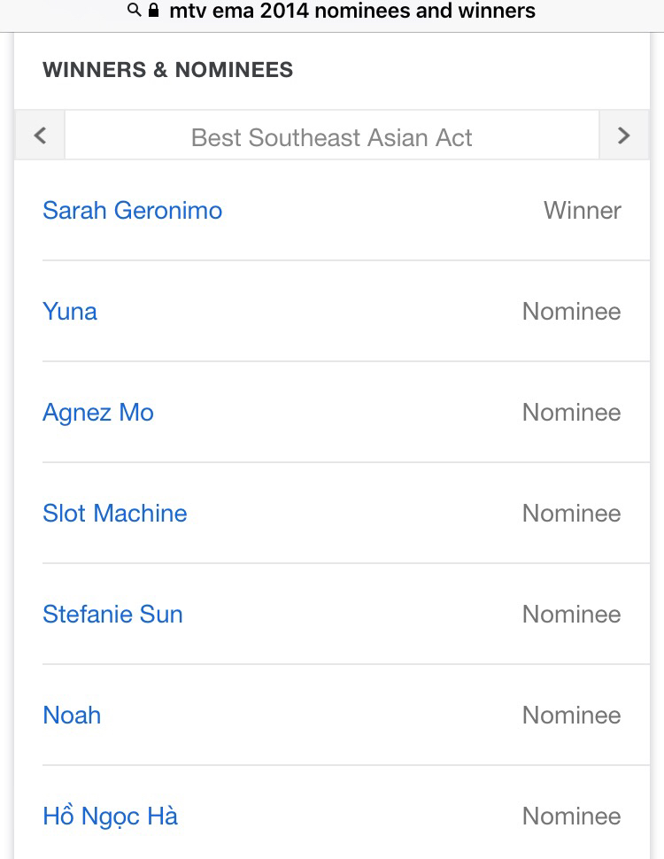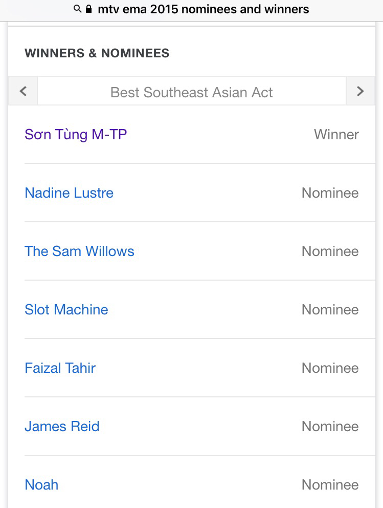 2014 Sarah Geronimo ฟิลิปปินส์ 2015 Son Tung M-TP เวียดนาม