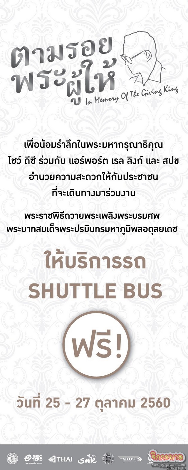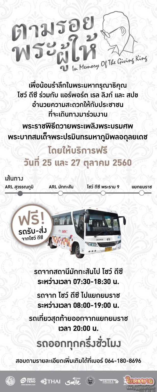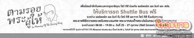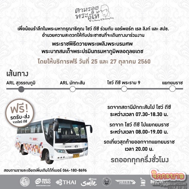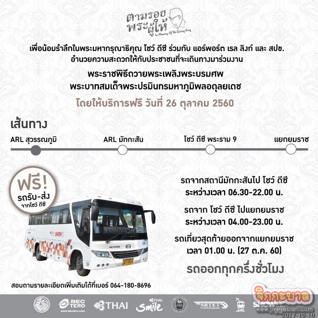 ศูนย์การค้าโชว์ ดีซี ร่วมกับ แอร์พอร์ต เรล ลิงก์ สมาคมผู้ประกอบการรถขนส่งทั่วไทย (สปข) การบินไทย ไทยสมายล์ และบีอีซี เทโร ร่วมทำความดีถวายเป็นพระราชกุศลจัดรถรับ-ส่ง (Shuttle bus) ฟรี เพื่อบริการประชาชนที่จะเดินทางไปยังบริเวณงานพระราชพิธีถวายพระเพลิงพระบรมศพพระบาทสมเด็จพระปรมินทรมหาภูมิพลอดุลยเดช บริเวณท้องสนามหลวง ระหว่างวันที่ 25 – 30 ตุลาคม 2560