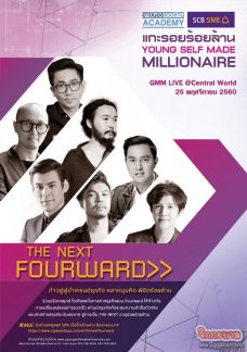 ร่วมปรับกลยุทธ์ ไอเดียและโอกาสทางธุรกิจแบบ Fourward ให้ก้าวทันการเปลี่ยนแปลงอย่างรวดเร็ว ผ่านนักธุรกิจที่ประสบความสําเร็จตัวจริง และนักสร้างสรรค์ระดับประเทศ ร้อยเรียง 4 แนวคิดสำคัญในการทำธุรกิจ ทั้งแรงบันดาลใจ ไอเดียพลิกธุรกิจจากความคิดสร้างสรรค์ เครื่องมือการเงินแถวหน้าของเมืองไทย พร้อมรับฟังประสบการณ์จากแขกรับเชิญพิเศษ ที่จะเจาะลึกวิธีคิด เทคนิค และวิธีการจาก 4 นักแกะรอยความสำเร็จแถวหน้าของเมืองไทย อาทิ จอนห์-วิญญ วงศ์สุรวัฒน์, ก้อง-อรรฆรัตน์ นิติพน, โหน่ง-วงศ์ทะนง ชัยณรงศ์สิงห์ และสุธีรพันธุ์ สักรวัตร ที่จะพาคุณ FOURWARD สู่การเป็น THE NEXT อายุน้อยร้อยล้าน พบกันวันเสาร์ที่ 25 พฤศจิกายนนี้ ที่ GMM Live House Central World ชั้น 8