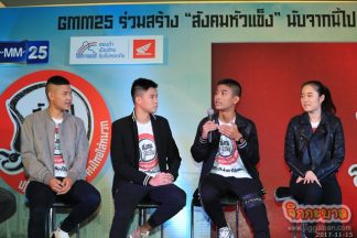 โดยมีคุณฉอด-สายทิพย์ มนตรีกุล ณ อยุธยา ประธานเจ้าหน้าที่บริหารสายธุรกิจ จีเอ็มเอ็ม แชนแนล จำกัด, คุณอารักษ์ พรประภา รองประธานกรรมการบริหาร บริษัท เอ.พี.ฮอนด้า จำกัด, คุณกอบชัย บุญอรณะ รองอธิบดีกรมป้องกันและบรรเทาสาธารณภัย กระทรวงมหาดไทย พร้อมด้วยเหล่าดารา นักแสดง อาทิ เป้-อารักษ์ อมรศุภศิริ, แคทรียา อิงลิช, เก้า-จิรายุ ละอองมณี, เต๋า-เศรษฐพงศ์ เพียงพอ, อาร์ต-พศุตม์ บานแย้ม, เฟย-ภัทร เอกแสงกุล, ปังปอนด์-อัครวุฒิ มังคลสุต, ก้อย-อรัชพร โภคินภากร นอกจากนี้ยังมี 2 พิธีกร ดีเจเป้-วิศวะ กิจตันขจร, ดีเจเจม-ณัฏฐ์ปวินท์ กุลกัลยาดี และมี กอล์ฟ ฟักกลิ้งฮีโร่ (พรีเซ็นเตอร์สังคมหัวแข็ง) Feat. น้องหญิง-ชนิตา วชิรเสรีชัย วงมีเทน (ชนะเลิศ Hotwave Music Awards 2017) โชว์เพลงสังคมหัวแข็ง ร่วมกันรณรงค์ ย้ำเตือนคนไทยให้ใส่หมวกกันน็อกทุกครั้ง เพื่อความปลอดภัย ในงานแถลงข่าว GMM25 ร่วมสร้างสังคมหัวแข็ง นับจากนี้ไป “ใครไม่ใส่เราไม่ยอม” ณ บริเวณล็อบบี้ อาคาร จีเอ็มเอ็ม แกรมมี่ เพลส (อโศก)