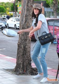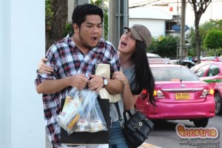 ฉากนี้ทีมงานยกกองไปถ่ายทำกันที่ป้ายรถเมล์ ย่าน สน.บางขุนนนท์ เมื่อทีมงานเซ็ตทุกอย่างพร้อม ผู้กำกับ โขม-ก้องเกียรติ ก็เรียกใหม่, เบน มาซ้อมบล็อคกิ้งกันก่อน โดยเฉพาะในจังหวะที่ใหม่ต้องเควี้ยงกระทะใส่หัวเบน งานนี้ทำเอาเบนถึงกับรีบเดินมาดูลีลาการซ้อมของสาวใหม่อย่างใกล้ชิด หลังใช้เวลาซ้อมจนแน่ใจว่าคล้องคิวกันดีแล้ว ผู้กำกับก็ส่งสัญญาณพร้อมถ่ายทำจริงทันที เริ่มที่ ใหม่แอบอยู่หลังต้นไม้เพื่อดักรอเบน ใหม่เห็นเบนเดินลงจากแท็กซี่มาด้วยอาการลั้นลา ก็รีบพุ่งออกมาล็อคคอเบนไว้จนแน่น พร้อมโวยวายทวงกระเป๋าสตางค์ของตนคืน เบนหันมาเห็นใหม่ก็ตกใจจนหน้าเสีย รีบแก้ตัวพัลวัลว่าใหม่เป็นคนทำตกเอง แถมตนยังต้องลำบากลำบนเก็บไว้ให้ พูดจบปุ๊ป เบนก็ส่งกระเป๋าสตางค์คืนให้ใหม่แล้วรีบเดินจากไปทันที ใหม่คว้ากระเป๋าสตางค์เปิดดูแล้วถึงกับกรี๊ดลั่น!! เพราะเงินในกระเป๋าหายไปหมดเกลี้ยง ใหม่โกรธจนเลือดขึ้นหน้า หันไปเห็นกระทะที่วางอยู่ใกล้ๆ จึงเขวี้ยงใส่เบนอย่างสุดพลัง จนกระทะลอยลอยละลิ่วไปโดนหัวเบนพอดิบพอดี เบนถึงกับหน้าคะมำ ใหม่รีบโดดไปขึ้นคร่อมหลังแล้วบีบคอเบนทันที เบนเห็นงานนี้คงไม่รอดชัวร์ เลยรีบสารภาพว่า เอาเงินของใหม่ไปใช้หมดแล้ว แล้วพูดเสียงอ่อยว่า “ถึงจะฆ่าให้ตาย ก็ไม่มีเงินมาใช้คืน” ทำเอาใหม่ถึงกับถอดใจ และปลงกับชีวิต