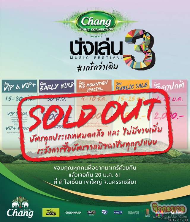 สร้างปรากฎการณ์แรงเกินคาด! สำหรับจีเอ็มเอ็ม แกรมมี่ที่เพิ่งเปิดขายบัตรเทศกาลดนตรี มิวสิค แอนด์ ไลฟ์สไตล์ เฟสติวัลที่เกร๋ไกร๋ที่สุด Chang Music Connection Presents นั่งเล่น Music Festival3 (ช้างมิวสิค คอนเนคชั่น พรีเซนต์ นั่งเล่น มิวสิค เฟสติวัล3)ซึ่งจะจัดขึ้นในวันเสาร์ที่20 มกราคม2561 ณดิโอเชี่ยน เขาใหญ่ จ.นครราชสีมานอกจากบัตร VIP และ VIP PLUSจะ SOLD OUT มาแล้ว งานนี้ทุบสถิติเมื่อเปิดขายบัตรEarly Bird เพียง10 ชั่วโมง ก็ SOLD OUT ทันทีเช่นกัน ชนิดที่บัตรทุกประเภทถูกขายหมดเกลี้ยงและจะไม่มีการขายบัตรเพิ่มอีกอย่างแน่นอน!!!