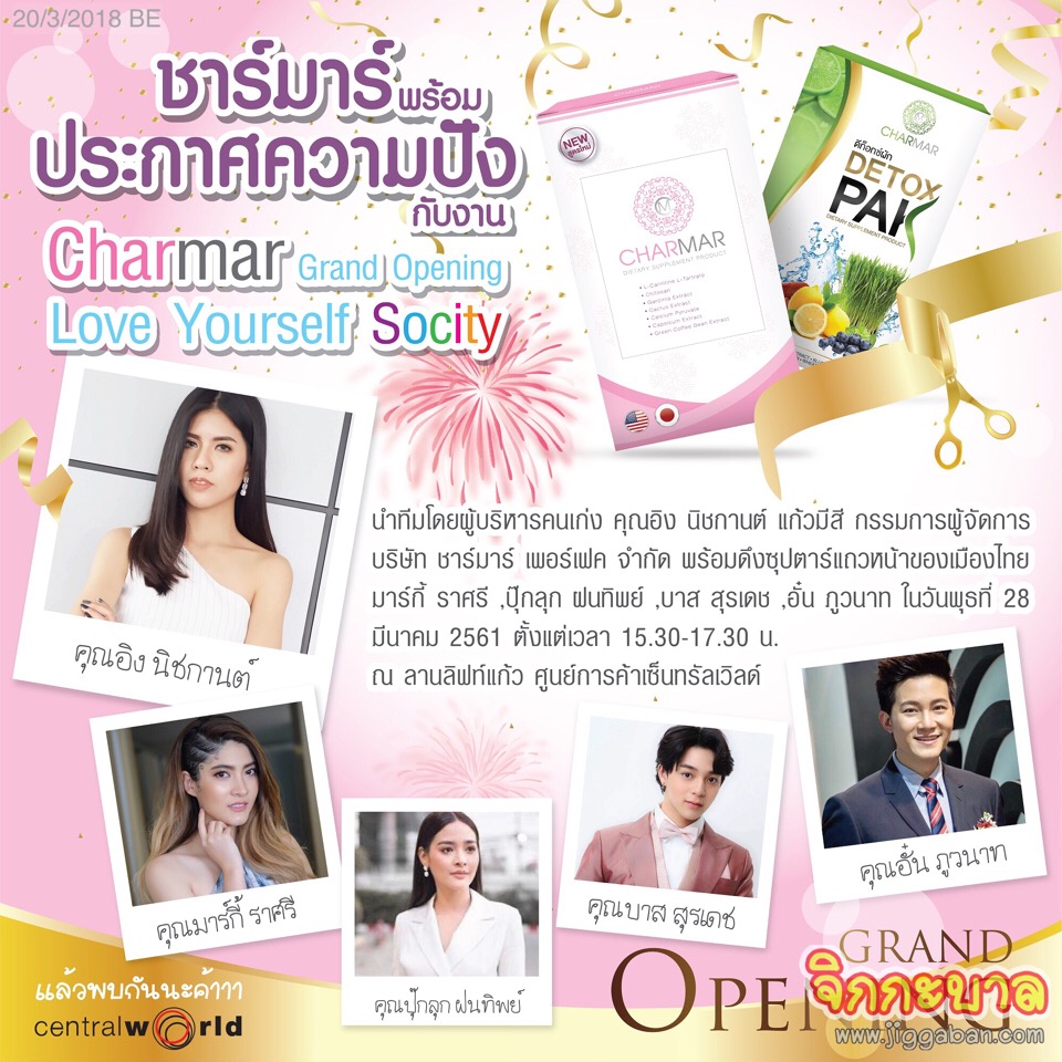 นำทีมโดยผู้บริหารสาววัยรุ่นร้อยล้าน คุณอิง นิชกานต์ แก้วมีสี กรรมการผู้จัดการ บริษัท ชาร์มาร์ เพอร์เฟค จำกัด ทุ่มงบจัดงาน Charmar Grand Opening Love Yourself Socity ดึงซุปตาร์แถวหน้าของเมืองไทย อาทิ มาร์กี้ ราศรี ,ปุ๊กลุก ฝนทิพย์ มาร่วมแชร์ประสบการณ์การดูแลหุ่นให้เฟิร์ม เป๊ะ และพบกับกิจกรรมสุดเซอร์ไพรส์จากขวัญใจวัยรุ่นอย่าง บาส สุรเดช โดยมีว่าที่คุณพ่อมากความสามารถ อั๋น ภูวนาท รับหน้าที่เป็นพิธีกร งานดังกล่าวจัดขึ้นในวันพุธที่ 28 มีนาคม 2561 ตั้งแต่เวลา 15.30-17.30 น. ณ ลานลิฟท์แก้ว ศูนย์การค้าเซ็นทรัลเวิลด์