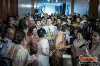 บรรยากาศงานครึกครื้นตั้งแต่แห่ขันหมากของหนุ่ม ป๊อก โดยเพื่อนเจ้าบ่าวพร้อมใจส่งเสียง โห่ ฮิว โห่ ฮิ่ว พร้อมสิ่งของมงคล อาทิ เงิน – ทอง – ผลไม้ – ขนมมงคล ฯลฯ ฝ่าด่านประตูเงิน ประตูทองทั้ง 20 ประตู โดยแก๊งนางเอกเพื่อนสนิทเจ้าสาว อย่าง ปวริศา เพ็ญชาติ, คิมเบอร์ลี่ แอน เทียมศิริ, ญาญ่า – อุรัสยา เสปอร์บันด์, มิ้น – ชาลิดา วิจิตรวงศ์ทอง, แพง – พรรณิดา ศรีสำราญ, พลอย – ชิดจันทร์ ห่ง, มะปราง- วิรากานต์ เสณีตันติกุล ฯลฯ ต่างเรียกค่าผ่านประตูกันยกใหญ่ ด้านเจ้าบ่าว ป๊อก ก็สู้ไม่ถอย ยอมทำทุกอย่าง เพื่อพิสูจน์ความรักที่มีต่อเจ้าสาว มาร์กี้ จนสามารถฝ่าด้าน มารับตัวเจ้าสาวเข้าพิธีสวมแหวนหมั้นในเวลา 11.09 น. ต่อด้วยพิธีรับไหว้