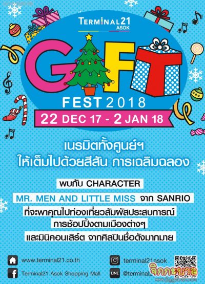 ศูนย์การค้าเทอร์มินอล21 อโศก ชวนนักช็อปมาเติมเต็มสีสันแห่งการเฉลิมฉลองคริสต์มาสและปีใหม่ ในงาน Gift Fest 2018 (กิ๊ฟต์ เฟสต์ 2018) สัมผัสประสบการณ์การช้อปปิ้งที่ไม่เหมือนใคร ไปพร้อมคาแรคเตอร์ Mr. Men (มิสเตอร์.เมน) and Little Miss (ลิตเติ้ลมิส) จาก Sanrio (ซาริโอ) กับสินค้าลิขสิทธิ์มากมาย อาทิ กระเป๋าเดินทาง, เครื่องนอน, ตุ๊กตา ฯ พร้อมดื่มด่ำไปกับบทเพลงที่ไพเราะ สนุกสนาน จากศิลปินชื่อดัง อาทิ เป็ก – ผลิตโชค, ว่าน – ธนกฤต, แพรว – คณิตกุล, วง Mild รวมทั้งไฮไลท์จากการแสดง Light and sound (ไลท์ แอนด์ ซาวน์) บริเวณทางเชื่อมรถไฟฟ้าชั้น M ตลอดเดือนธันวาคม นี้