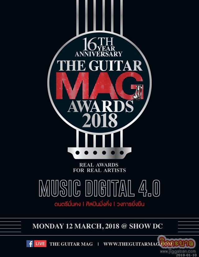 โดยธีมการจัดงานครั้งนี้คือ “Music Digital 4.0 ดนตรีมั่นคง ศิลปินมั่งคั่ง วงการยั่งยืน” มีเหล่าศิลปินร่วมตบเท้าโชว์สุดแสนพิเศษ อาทิ Klear, The Toys, BNK48, The Rube เป็นต้น พิเศษสุด! ร่วมเป็นคณะกรรมการตัดสินให้ศิลปินในดวงใจของคุณกันได้ในสาขา Popular Vote ทางแฟนเพจ The Guitar Mag และ Line Official : The Guitar Magazine ส่วนใครที่สนใจเข้าร่วมในวันงาน “The Guitar Mag Awards 2018” เพียงแค่ถือ The Guitar Mag ฉบับกุมภาพันธ์ หรือ มีนาคม 2561 ก็สามารถแลกบัตรเข้าร่วมงานได้ทันที! “The Guitar Mag Awards 2018” จะจัดขึ้นในวันที่ 12 มีนาคม เวลา 18.00 – 22.30น. ณ Ongbak Hall ชั้น 6 ศูนย์การค้า Show DC ติดตามอัพเดทผู้เข้าชิงรางวัลทั้ง 13สาขา และความเคลื่อนไหวของงานนี้ได้ทาง www.TheGuitarMag.com และ Facebook: The Guitar Mag