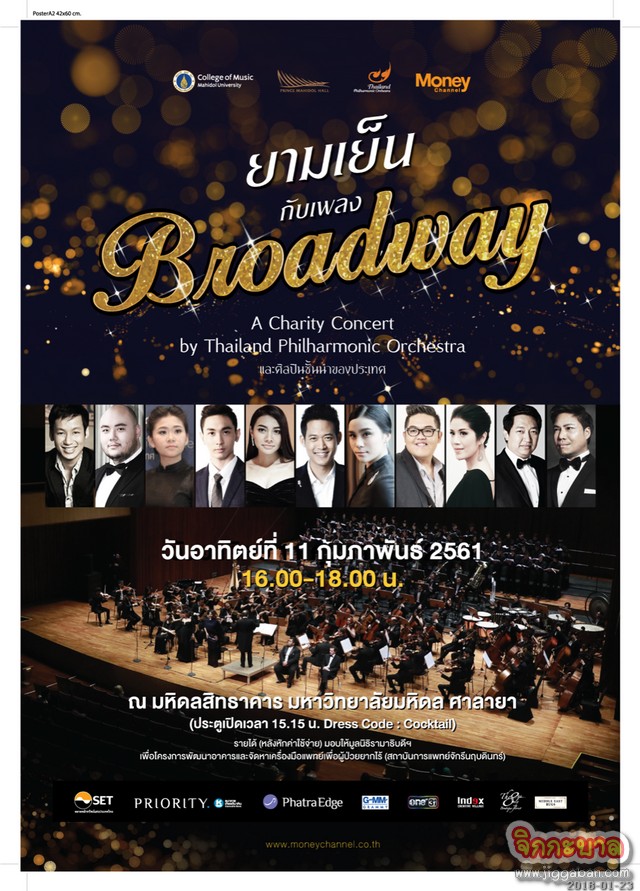 คอนเสิร์ตการกุศล “ยามเย็นกับเพลงบรอดเวย์” รายได้หลังหักค่าใช้จ่ายมอบให้มูลนิธิรามาธิบดี เพื่อโครงการพัฒนาอาคารและจัดหาเครื่องมือแพทย์เพื่อผู้ป่วยยากไร้ (สถาบันการแพทย์จักรีนฤบดินทร์) สำหรับผู้ที่ต้องการร่วมบริจาคสามารถสมทบทุนได้ที่ ธนาคารไทยพาณิชย์ สาขารามาธิบดี ชื่อบัญชี มูลนิธิรามาธิบดี เลขที่ 026-4-26671-5 ส่วนผู้สนใจเข้าชมคอนเสิร์ตสามารถดูรายละเอียดและติดต่อขอรับบัตรได้ 2 ช่องทาง คือ 1. ร่วมสนุกตอบคำถามว่า “ความดีที่คุณตั้งใจทำในปีนี้คือ….” ทาง www.moneychannel.co.th ตั้งแต่วันนี้ – 31 มกราคม 2561 ประกาศรายชื่อผู้ได้รับบัตร 50 ท่าน ท่านละ 2 ที่นั่ง ในวันที่ 2 กุมภาพันธ์ 2561 และ 2. ร่วมสนุกรับบัตรคอนเสิร์ตได้จากรายการ “ONE บันเทิง” ทุกวันจันทร์-ศุกร์ เวลา 12.30-13.00 น. ทางช่อง ONE 31 / สอบถามรายละเอียดเพิ่มเติมได้ที่ 0-2009-9988 กด 2